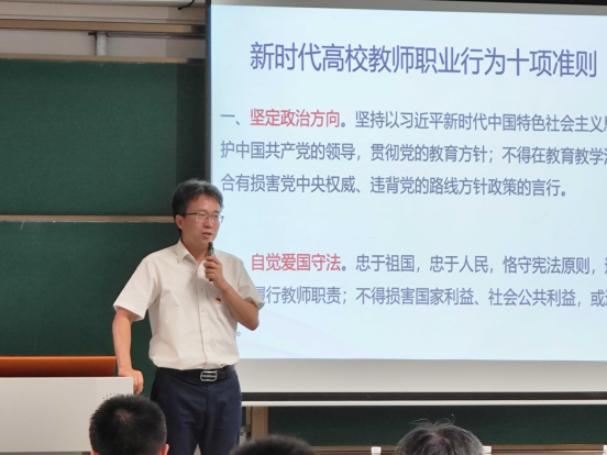 随后,刘群锋详细解读了新时代高校教师职业行为十项准则。这十项准则涵盖了政治方向、爱国守法、传播优秀文化、教书育人、关心爱护学生、言行雅正、遵守学术规范、公平诚信、廉洁自律和积极奉献社会等方面,为全体教职工指明了职业行为的标准和方向。