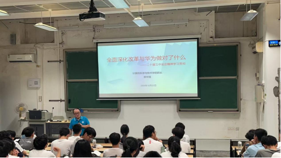 10月22日上午,sunbet申博院长袁华强在6E-104教室为2024级计算机类7班、2024级网络空间安全1班和2024级网络空间安全2班的120名学生带来了新学期的“思政第一课”。本次课程紧密围绕党的二十届三中全会精神,以“全面深化改革与华为做对了什么”为主题,为新生们带来了一场深刻而生动的思想教育。