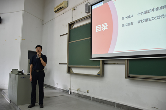 胡钦华主任首先通过1份重要文件、评价系列重大活动、作出1个重要判断、强调13个“显著优势”、提出1个“总体目标”、明确13个“坚持和完善”等内容传达学习全会主要精神,然后由浅入深重点分析了健全人民文化权益保障制度、构建服务全民终身学习的教育体系以及社会治理共同体等内容,最后对治理体系与治理能力的现代化等内容进行核心解读,深刻理解坚持和完善中国特色社会主义制度、推进国家治理体系和治理能力现代化的总体要求和总体目标。胡钦华主任认为本次全会的主题重大,事关根本,成果丰硕,影响深远。随后,他围绕学校第三次党代会工作报告,通过9个方面回顾,5条经验,9点不足,2步走目标,5大发展战略以及今后5年工作总体要求,重点任务及主要举措一系列数字进行了讲述。