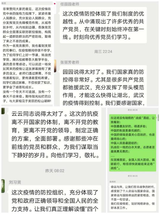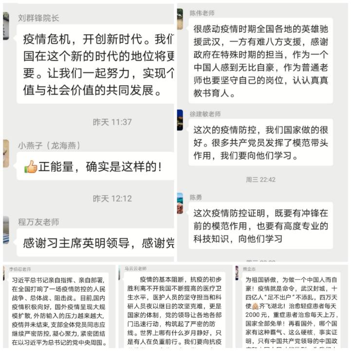 别样的形式,不变的决心,在这次“云党日”活动,大家都学到了很多,抗击疫情要审时度势,因时施策,党员的思想也要与时俱进,不断发展。就像李伯忍书记在感想中所述:应以“我是党员, 我先上”的使命担当精神, 做好在线教学, 通过网络传递着知识, 撒播希望, 期待春暖花开。