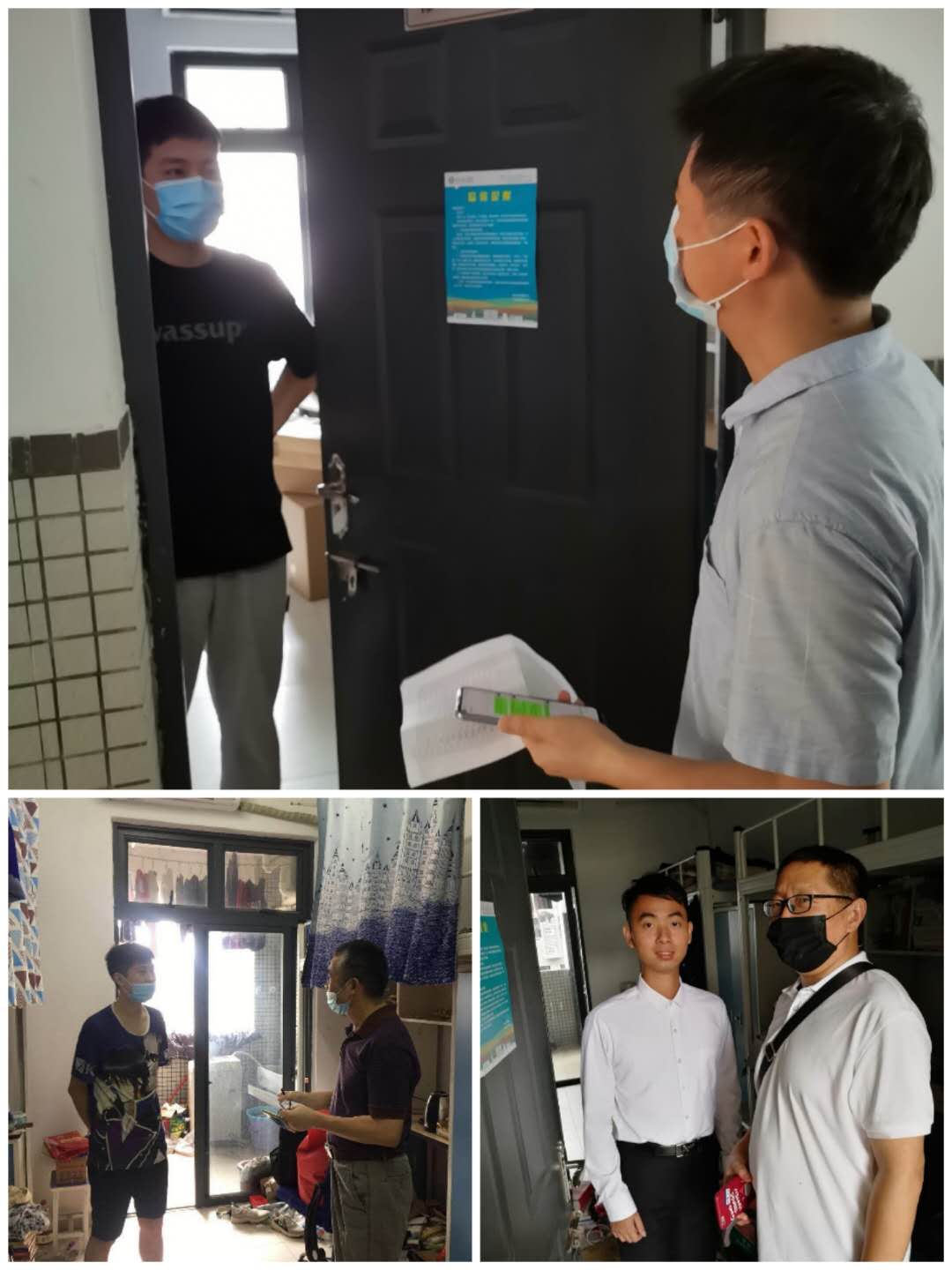 为避免人多聚集,李伯忍、李绍明、刘习贤和王立本4位党员志愿者分两批进入学生社区,本次走访共计60多位学生。来到学生宿舍后,老师们多方面了解毕业生返校情况,询问毕业答辩及就业等相关事宜,并根据具体问题提出一些建议和要求。希望同学们返校后严格遵守学校关于疫情防控相关规定,要勤洗手、勤消毒、多通风,保持室内环境卫生;出门要佩戴口罩,在食堂要间隔排队有序就餐;在规定的时间内有序办理完毕业相关手续;呼吁同学们以积极健康乐观的心态面对当下疫情期间的毕业和就业压力,并祝福大家顺利毕业!
