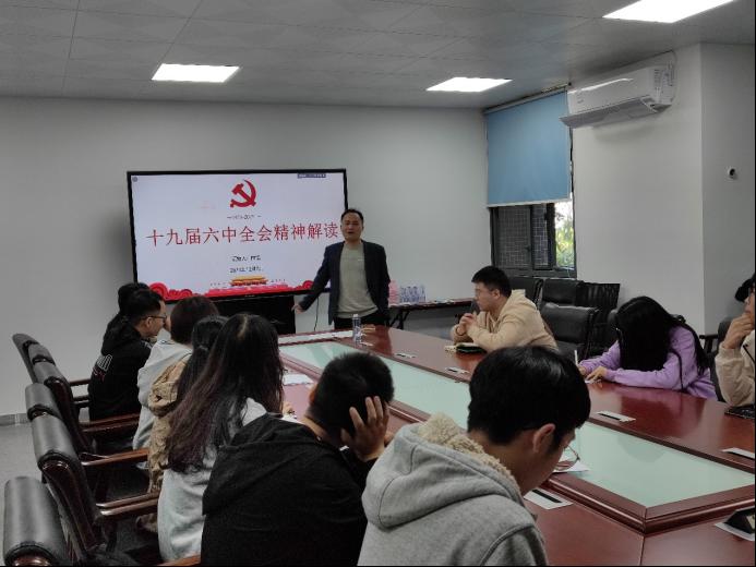 12月7日上午,sunbet申博,申博官网,sunbet官网研究生党支部于8A-306开展“党的十九届六中全会精神解读”专题党课及专题学习研讨会。本次党课的主讲人为sunbet申博副院长陶铭,参与人员为研究生党支部全体党员。