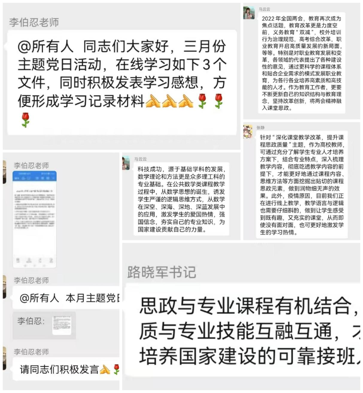然后,支部书记李伯忍同志组织党员针对“如何在平时的教学过程中更好地融入课程思政元素,激发学生的学习热情和使命担当”问题,进行了“深化课堂教学改革,提升课程思政质量”的深入研讨。接着,路晓军同志在微信群分享道,思政与专业课程有机结合,思想素质与专业技能互融互通,才能真正培养国家建设的可靠接班人。