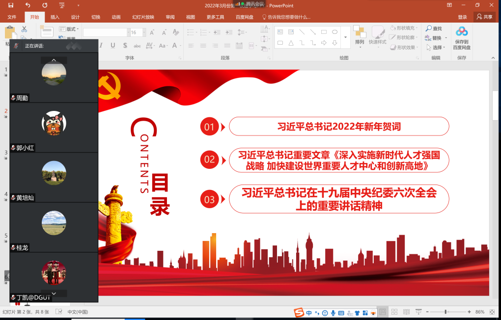 陶铭同志组织与会党员同志集体学习了习近平总书记2022年新年贺词、习近平总书记重要文章《深入实施新时代人才强国战略 加快建设世界重要人才中心和创新高地》、习近平总书记在十九届中央纪委六次全会上的重要讲话精神。教师党员代表陈传祥同志和学生党员代表周翰林同志就各自的学习体会进行了发言。