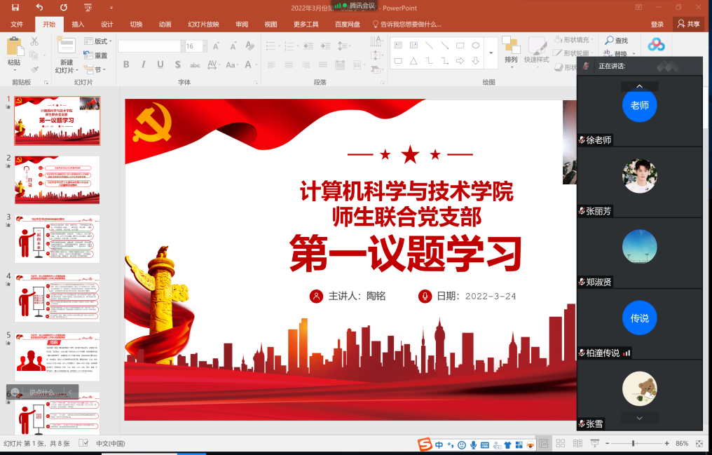 2022年3月24日下午14:30,按照学校学院各级党委的部署,我院师生联合党支部在腾讯会议平台召开了第一议题学习会。本次会议由支部书记陶铭同志主持。
