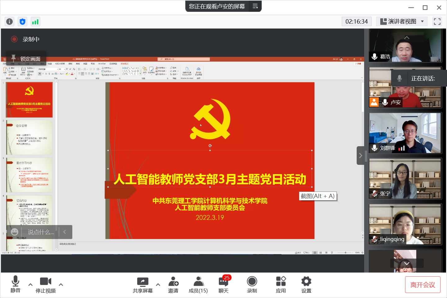 为深入学习贯彻习近平新时代中国特色社会主义思想,深刻领会“两会”精神,深入学习贯彻习近平总书记关于教育的重要论述,落实教育部《高等学校课程思政建设指导纲要》和《广东省教育厅关于强化课程思政建设一流课程的意见》,充分发挥课堂主渠道作用,全面推进“课程思政”建设工作,落实立德树人根本任务,坚定教师党员理想信念,激发党员教师工作热情,3月19日人工智能党支部组织线上开展了“深化课堂教学改革,提升课程思政质量”主题党日活动,本次活动由人工智能党支部书记卢安主持,支部全体成员参与。