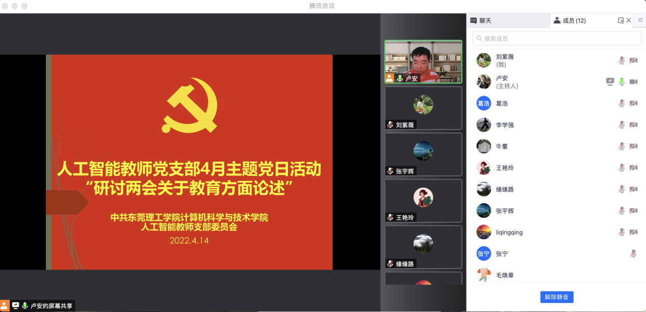 为深入学习贯彻习近平新时代中国特色社会主义思想,深刻领会两会精神,4月14日人工智能党支部组织线上开展了“研讨两会关于教育方面论述”主题党日活动,本次活动由人工智能教师党支部书记卢安主持,支部全体成员参与。