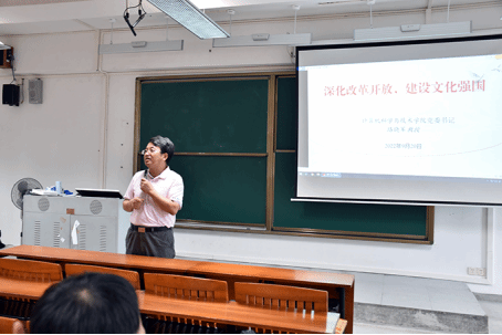 课程伊始,路晓军结合个人的经历向同学们介绍了sunbet申博近30年来所取得的成就。随后,路晓军从全面深化改革开放、文化强国建设、坚持党的全面领导三个方面向同学们讲述了东莞改革开放以来的改变。最后,路晓军就“大学生应有的信仰”、“大学生应有的规划”、“大学生怎样建立积极向上的人生观”三个思考给予同学们关于学习生活的建议。