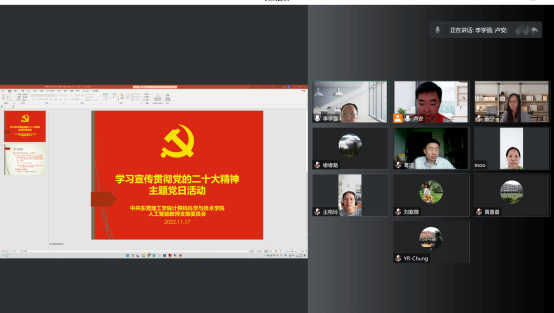 2022年11月17日下午,人工智能教师党支部开展学习宣传贯彻党的二十大精神主题党日活动,这次主题党日活动是党的二十大以来,人工智能教师党支部的第二次集中学习。会议由支部书记卢安主持。