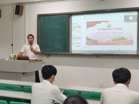 首先进行党的二十大精神学习,邓武均书记首先为我们解读二十大报告的主题,然后把过去五年的工作成就和新时代十年的伟大变革一一展示出来。接着学习 “六个坚持”:坚持人民至上、坚持自信自立、坚持守正创新、坚持问题导向、坚持系统观念、坚持胸怀天下。在学习新时代新征程中国共产党的使命任务时,邓武均书记希望大家要发扬斗争精神,要敢于面对困难,敢于斗争。在学习教育、科技及人才战略时,我们要充分认识到青年强国家强,作为新时代的大学生,我们认真学习专业知识,为以后更好建设祖国储蓄力量。最后邓武均书记认为全面从严治党能够维持中国共产党的生命力,必须要坚持反腐,党员同志必须要严格遵守党章党规党纪。
