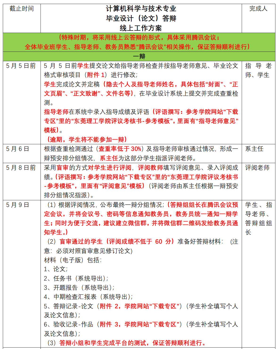 经学院教学委员会审核,现发布计科专业2020届毕业设计答辩工作的安排,本次毕业答辩,情况特殊,时间紧(比去年快一周),任务重(计科学生比去年加100多),请老师们和同学们认真阅读通知,积极配合。谢谢!