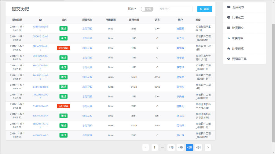 在整个比赛过程中,我院自研的OJ平台运行平稳,并经受住了运营以来最大并发访问流量的挑战。根据比赛约定,前120名同学将获得11月22日下午正式比赛的参赛资格。OJ平台显示,上述120名同学均在4小时内,成功解决7道以上编程题目。