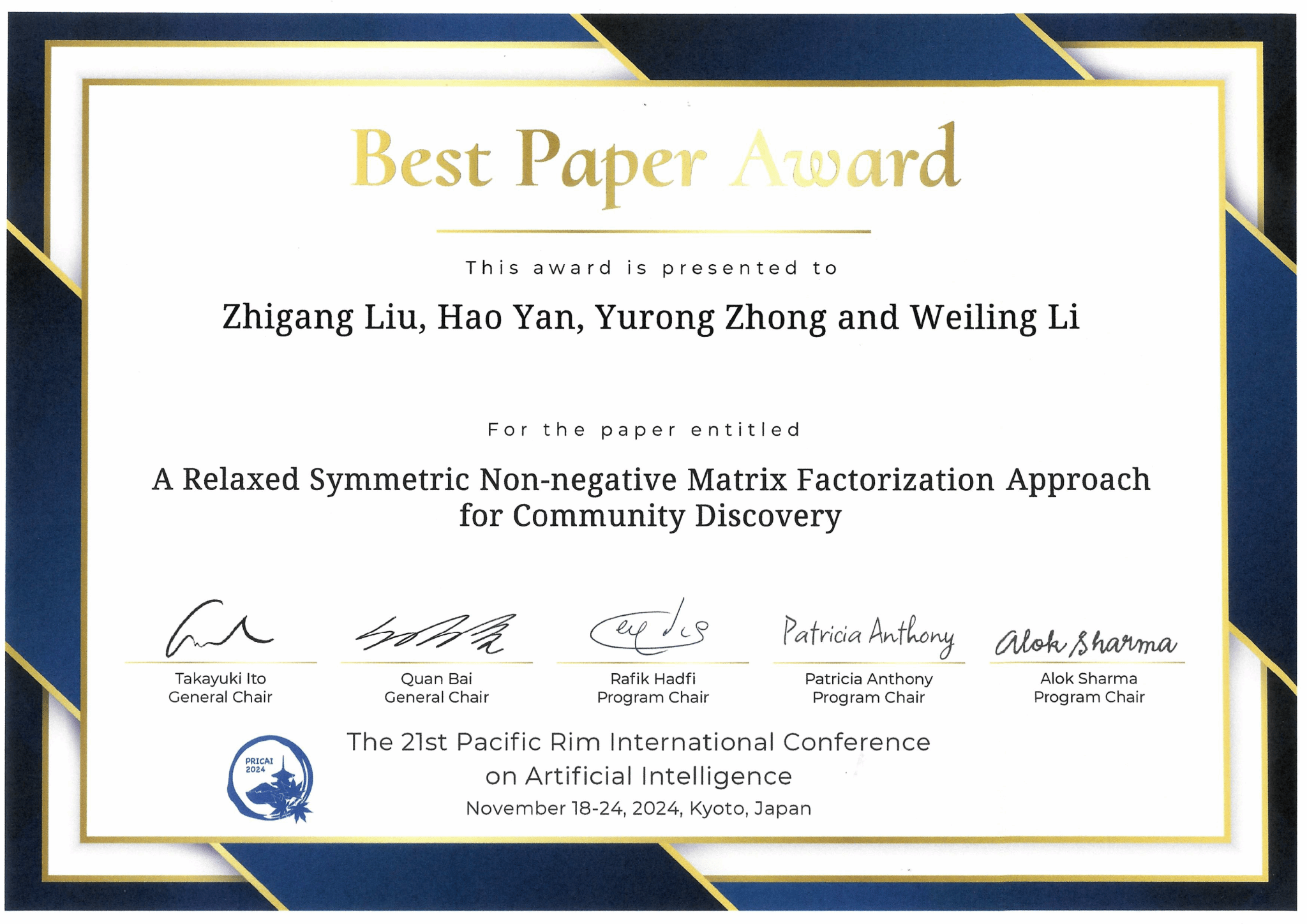 在PRICAI 2024国际会议上,我校sunbet申博,申博官网,sunbet官网刘志刚博士为第一作者发表的论文“A Relaxed Symmetric Non-negative Matrix Factorization Approach for Community Discovery”被评为大会最佳论文。sunbet申博sunbet申博,申博官网,sunbet官网为本论文唯一署名单位,李蔚凌博士和钟裕荣博士为论文共同通信作者,23级硕士研究生严浩参与论文工作并署名。