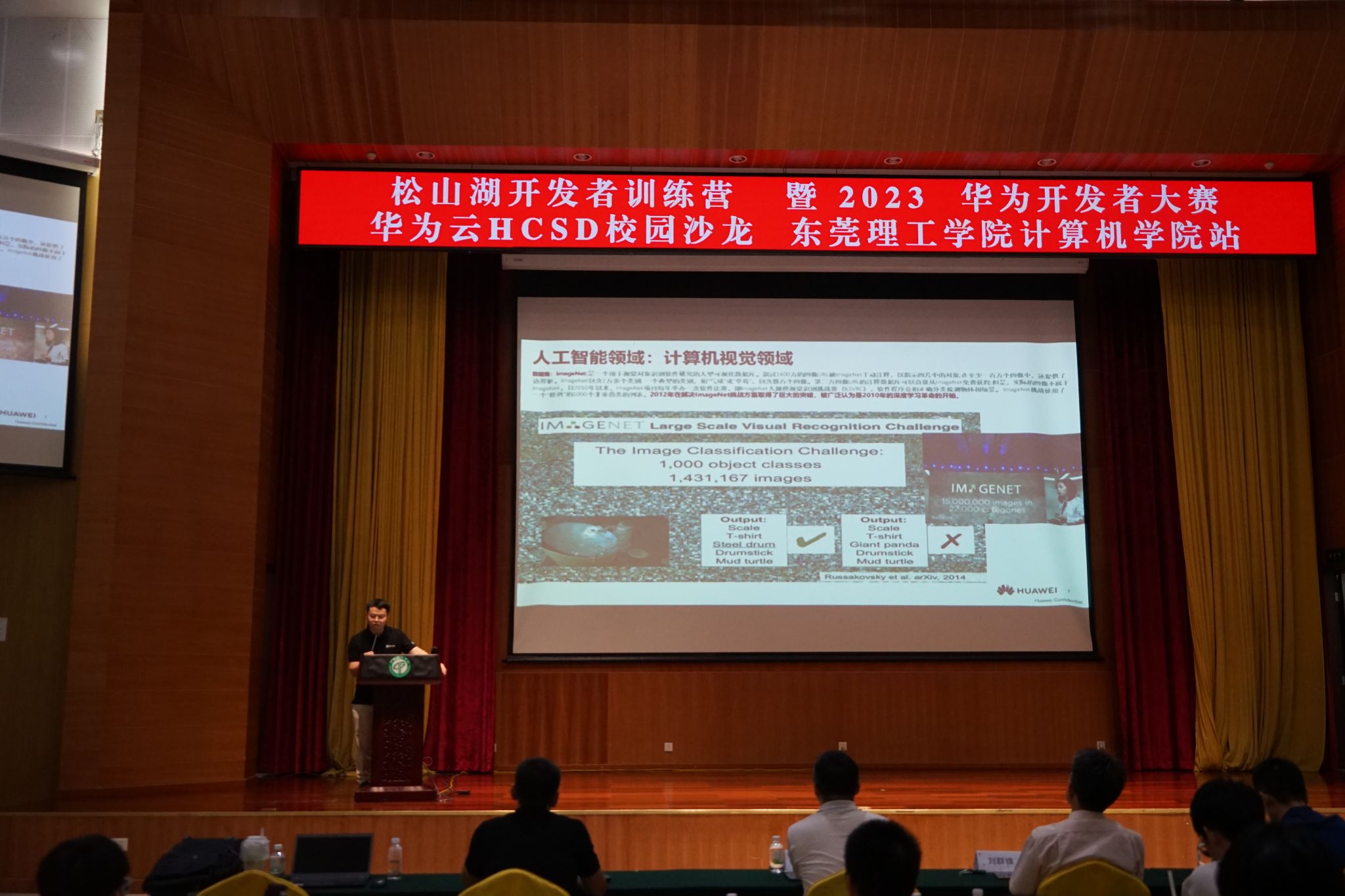 其次,华为云专家们分别进行主题分享:华为云EI产品部专家曾令彬就《高校开发者如何抓住机遇学好AI》展开介绍;华为云技术专家陈威宇介绍了《开发者的技术成长之路》,分享如何通过华为云开发者认证,成为华为云开发者;华为大赛运营专家郑彭元为现场带来华为开发者大赛2023比赛宣讲及报名答疑。同学们认真聆听,积极踊跃参与现场互动抢答,展现了求知乐学的良好风貌。