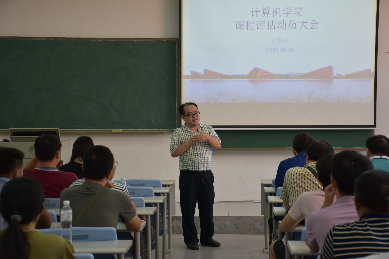 接着,学院教学副院长刘群锋作课程评估动员,从国家意志、学校安排、学院部属三个方面进行分析,并对课程评估指标进行解读。刘群副院长针对精品课程的建设提出了明确的要求:要打造有高阶、有创新、有挑战的精品课程。他希望老师们能够“回归本分,回归梦想,做好本职工作;积极参与,服从安排,共建优质课程”。