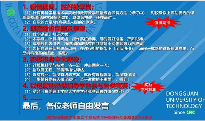 2020年3月26日上午,系统与网络课程组在线上召开了在线教学例会。会议内容具体如下。