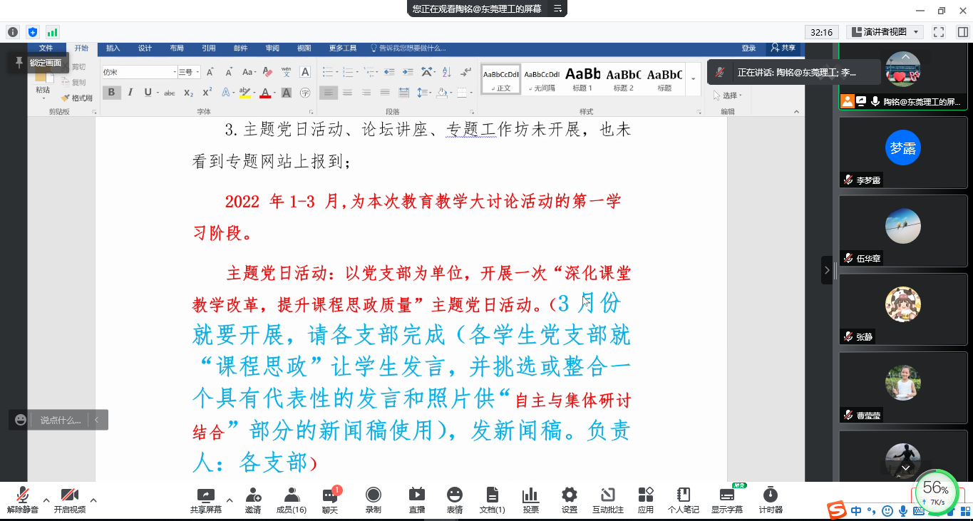 本次会议,副院长陶铭老师对本学期近期的相关工作进行详细的部署和安排。例如:教育教学大讨论第一阶段工作、广东省特支教学名师申报工作、教学大纲调整工作、招生工作、教学管理方面的工作等等。陶铭老师还对前3周在线教学工作中出现的问题进行了总结,提醒各系(部)主任及课程组长务必提醒组内老师严格按照课表上课,做好个人防护的同时,保证教学质量。各系(部)主任及课程组长积极响应,纷纷表示要在当前疫情防控的特殊阶段,认真做好各项工作,为后续工作的顺利开展起到推进作用。