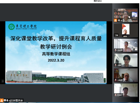2022320日下午16:00-17:00高等数学和工程数学课程组在腾讯会议平台举行了深化课堂教学改革,提升课程育人质量教学研讨例会。会议由肖静老师主持,高等数学和工程数学课程组全体老师参会。