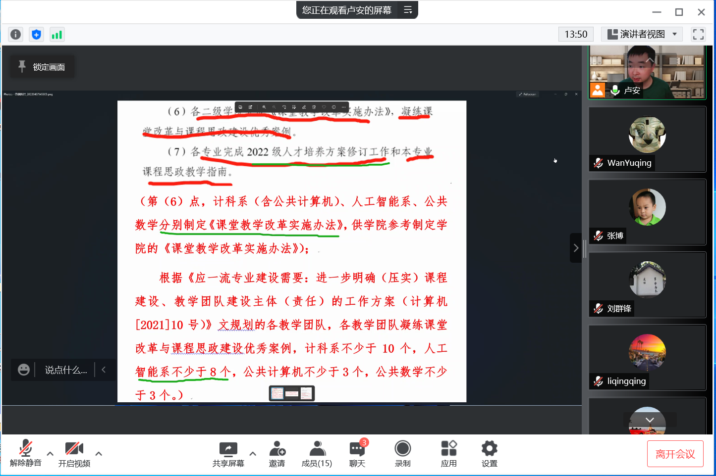 卢安老师展示数据科学与大数据专业人才培养方案以及修订方案,并征集大家意见。同时,传达4月教学例会内容,主要包括各学院做好各类重修、结业考试的命题工作、在线教学的实施督查与保障工作、专升本和三二分段招生考试任务命题工作、督促毕业设计工作的进度等。此外,强调人工智能系教学团队需要凝练课堂改革与课程思政建设优秀案例不少于八个。会议上还介绍了教育部认可的56项全国大学生学科竞赛名单,并强调适合人工智能系学生参加的比赛项目。