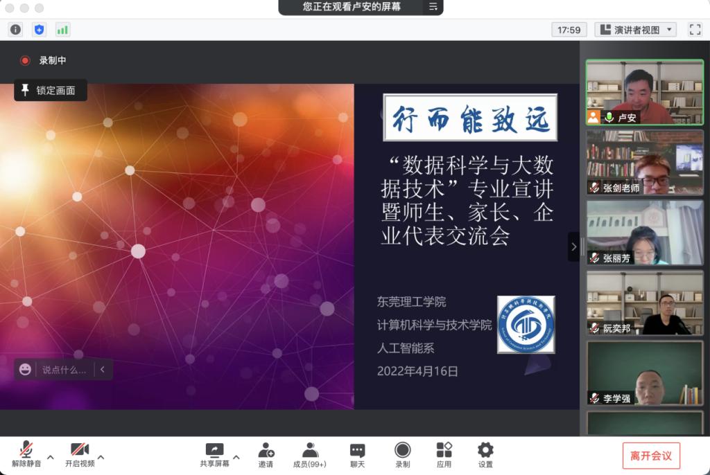 2022年4月16日上午,人工智能系在腾讯会议平台召开了线上讨论与宣讲座谈会,sunbet申博2020级、2021级学生、家长代表、校友代表、企业代表、人工智能系全体教师和人工智能教师党支部全体党员近400人参加了会议,时长超过3小时。会议由系主任卢安老师主持,主要围绕“数据科学与大数据技术专业学什么、如何学、毕业去向”等方面进行了专题宣讲与讨论座谈。