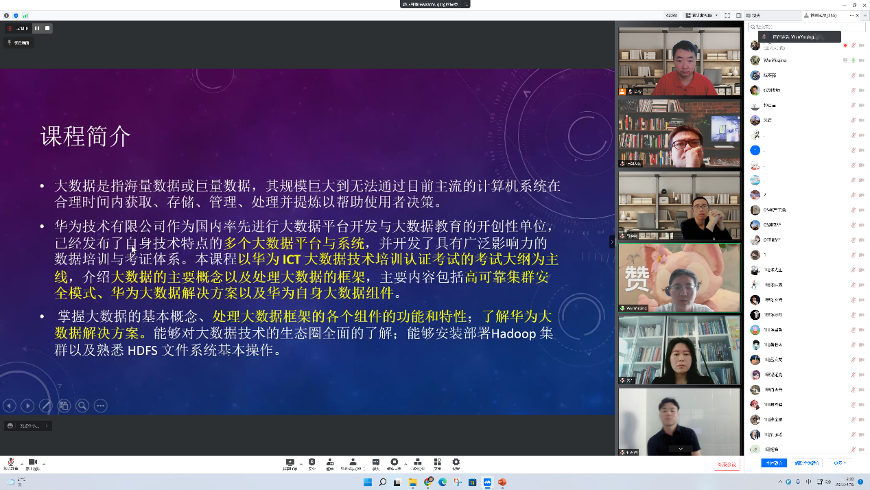 紧接着,进入老师分享环节,由各位老师分别介绍数据科学与大数据专业的核心课程及考研、就业、考公务员等内容,具体包括:万宇晴老师介绍大数据、华为认证大数据课程;阮奕邦老师介绍大数据高级专题,以及大数据平台上的采集存储分析应用开发;朱君老师通过数据可视化案例的介绍来生动的说明该技术的应用场景;潘晓衡老师对云计算与大数据专业、人工智能之间的关系进行介绍,并讲述了国家职业技术技能标准来看大数据技术的重要性以及简历如何写等问题;张宁老师对机器学习课程的内容与应用场景以及机器学习相关的就业前景进行了介绍;张丽芳老师通过对数学建模的介绍,建议同学们从项目比赛入手,在比赛中成长;李青青老师则对考公务员、华为认证人工智能课程的学习进行了介绍;欧阳晨老师对大数据专业同学本省高校中研究生报考方向进行了介绍,特别提到交叉学科的考研成功率更高一些;张剑、张宇辉老师对人工智能及高级专题课程以及就业前景进行了分析介绍。