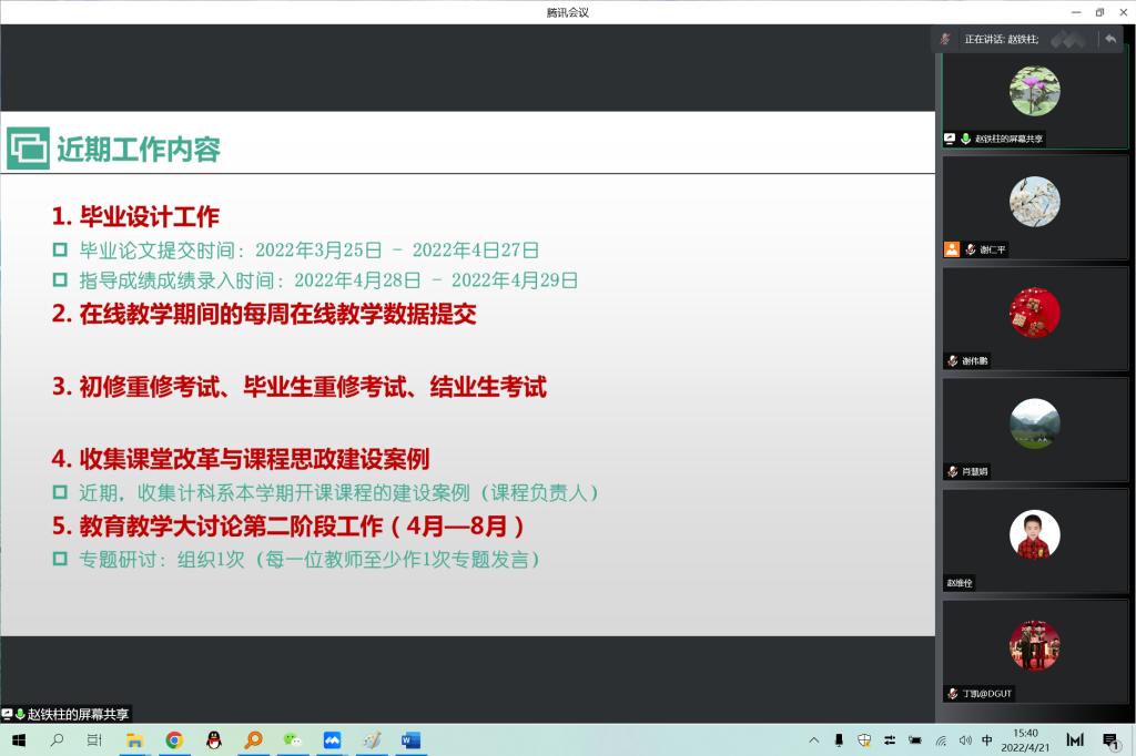 2022年4月25日下午,计算机科学与技术系在腾讯会议平台召开了线上讨论会,全体教师参加了会议。会议由系主任赵铁柱老师主持,主要围绕下一阶段的主要教学工作任务以及第二阶段的教育教学大讨论进行展开。