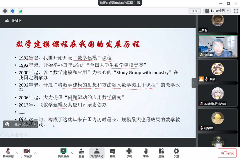 会上,董教授从数学建模竞赛的含金量、四项功能方面着手,鼓励同学们要以竞赛为契机,打开数学大门,通过实际尝试去参与发现和创造数学的过程,进而更好地应用、理解和热爱数学。