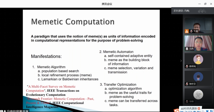 在报告会上,首先由冯亮教授为我们介绍了Memetic算法的相关知识。冯亮老师先是传统的角度介绍Memetic算法是全局搜索与局部搜索相结合一种算法。由于局部搜索的引入,相比于单纯的全局搜索,Memetic算法在复杂优化问题中取得了很大的成功。然而,Meme的定义本身并非局限于局部搜索。随后冯亮老师结合实际应用中的实例为我们介绍Memetic Computation还包含Memetic Automaton和Transfer Optimization。冯亮老师指出关于Meme本身的定义挖掘,从而设计更多的Memetic计算框架,从而改进问题求解效率是目前Memetic计算领域的热点方向之一。