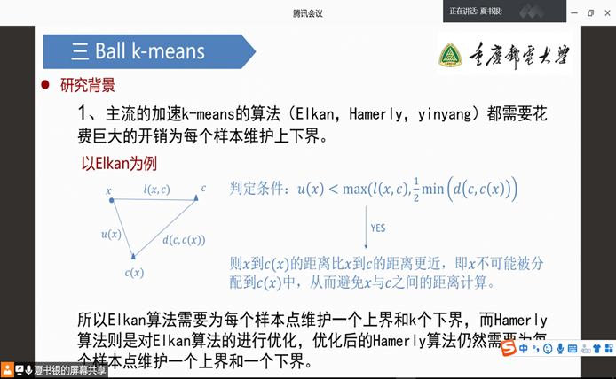 应sunbet申博和东莞市重点实验室I4Lab的邀请,重庆邮电大学夏书银教授为我校多位教师和研究生作了题为《基于多粒球的机器学习理论与Ball Kmeans聚类算法》的学术报告,本报告主要围绕最新发表在国际顶刊IEEE TPAMI上的论文《A Fast Adaptive k-means with No Bound》进行。由于疫情的影响,本次学术报告会采用两种形式举行,夏老师的报告采用线上的形式,而参会的老师以及同学主要在8A307共同聆听夏教授带来的精彩报告并进行现场讨论。尽管夏书银教授未能来到我校,只能通过线上的形式,但这也阻挡不住夏书银老师的激情报告,以及老师、同学们的激烈讨论。