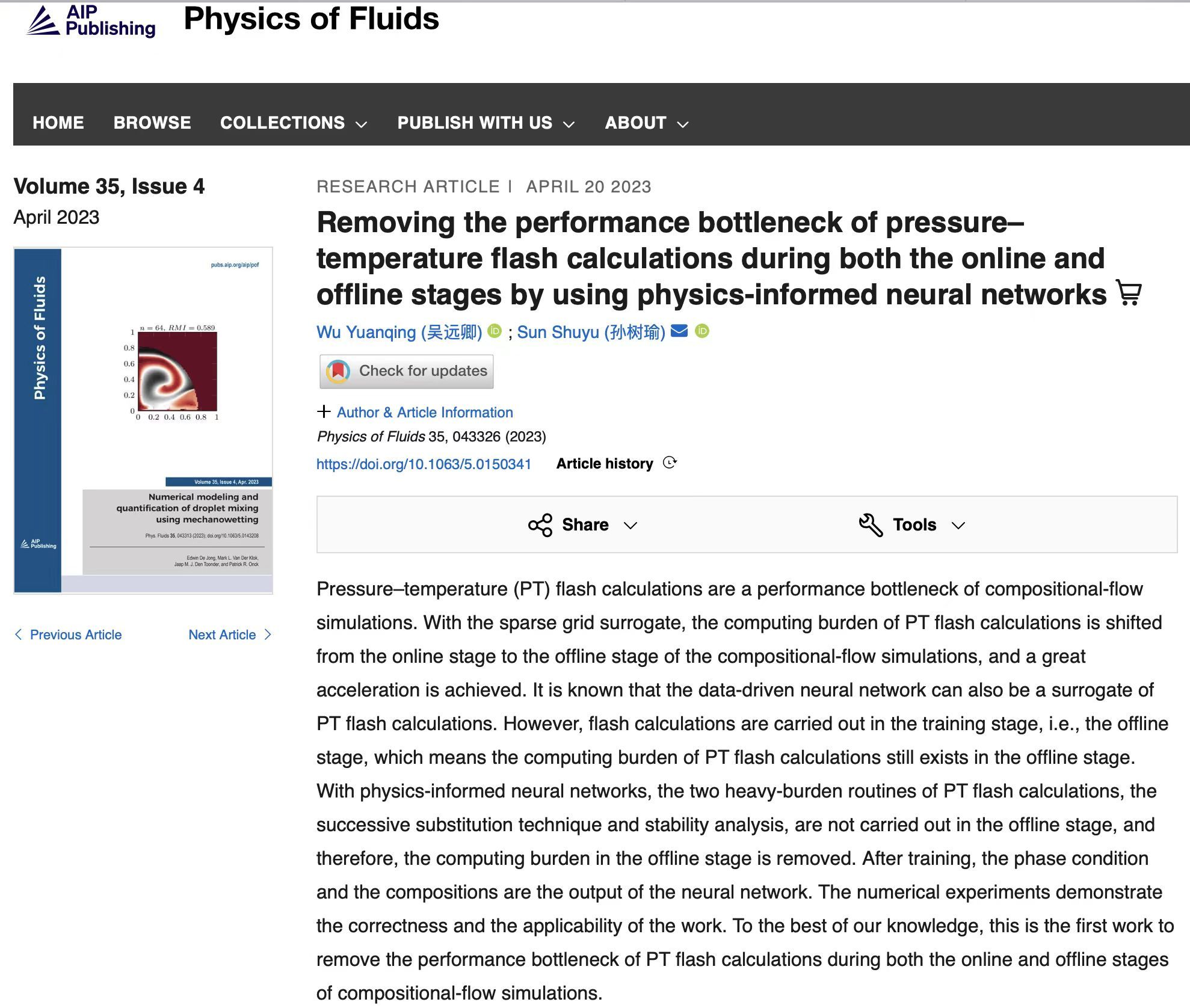 近日,吴远卿特聘副教授在流体力学领域权威期刊Physics of Fluids (IF=4.980,中科院1区,TOP期刊)发表题目为Removing the performance bottleneck of pressure–temperature flash calculations during both the online and offline stages by using physics-informed neural networks的研究论文(DOI: https://doi.org/10.1063/5.0150341)。sunbet申博为本文第一完成单位,阿卜杜拉国王科技大学的孙树瑜教授为本文通讯作者。据悉,这也是sunbet申博首次以第一完成单位在该期刊发文。