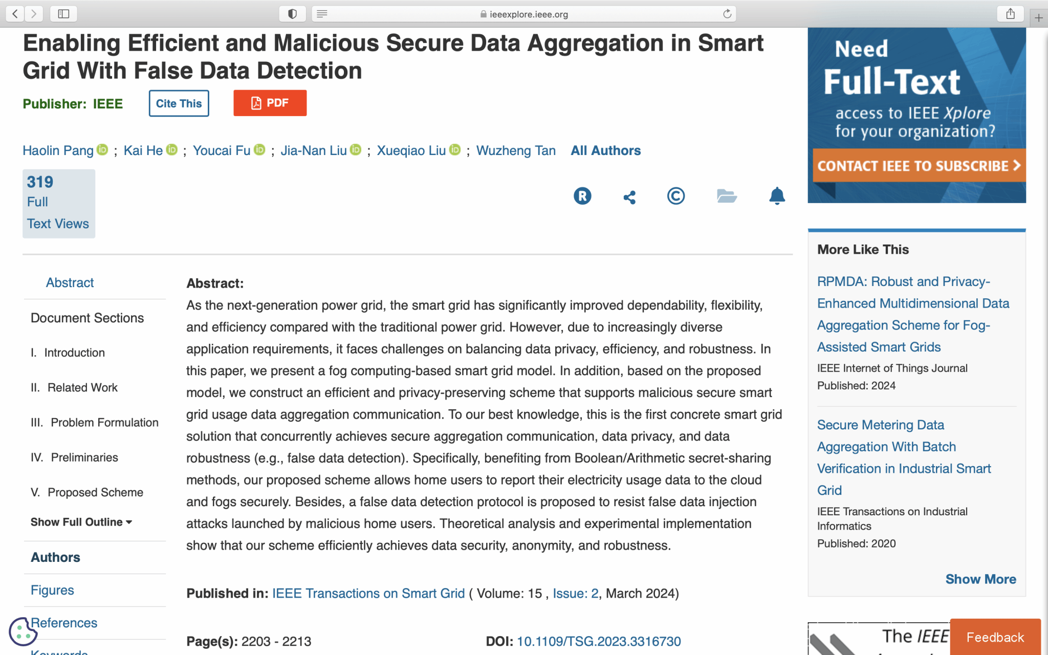 2024年3月,我校sunbet申博,申博官网,sunbet官网网络空间安全系刘家男副研究员课题组在智能电网领域TOP期刊IEEE Transactions on Smart Grid(中科院SCI 1区期刊,T2期刊)发表了题为“Enabling Efficient and Malicious Secure Data Aggregation in Smart Grid with False Data Detection”的研究论文。我校2020级硕士研究生庞浩霖为论文的第一作者,刘家男副研究员为论文的通信作者,我校何凯副教授、澳大利亚伍伦贡大学Xueqiao Liu副教授与暨南大学谭武征教授为论文提供指导并署名。