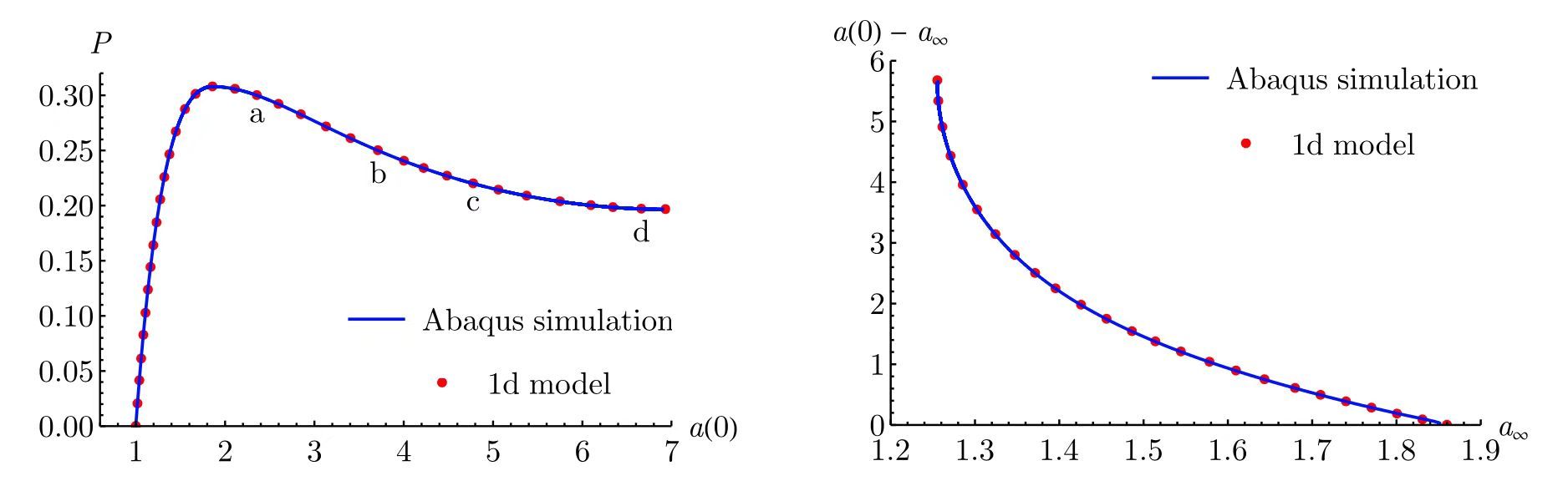 本研究基于Audoly和Hutchinson(JMPS 2016, 97, 68–91.)提出的降维方法,从三维有限应变理论出发,推导了用于描述有限壁厚超弹性充气圆管起鼓的一维模型。该一维模型使得利用简单数值方法,如有限差分法,来描述有限厚壁圆管的轴对称变形变得容易。与数值模拟结果的对比表明,对于起鼓问题,该一维模型能够非常准确地描述起鼓从起始、生长到扩展的整个过程(图2)。该一维模型为之后研究各向异性、电载荷以及破裂等效应提供了一个起点。