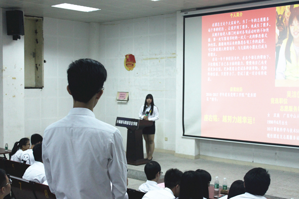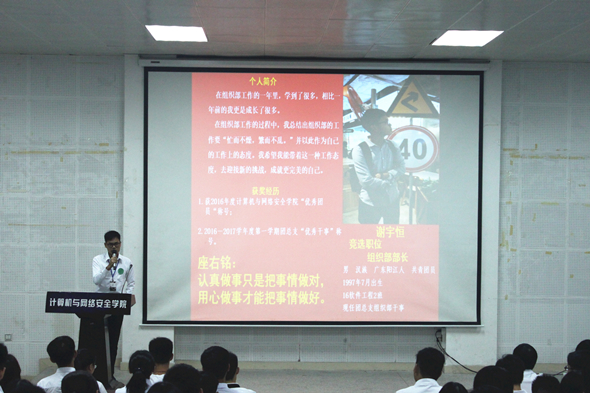 会议开始前,团总支各成员衣着正式整洁,在各自的座位上静候会议的开始。随着秘书处通报会议出席情况,本次会议正式开始。会议伊始,全体起立,合唱共青团歌。一时间,整齐划一、恢弘庄重的歌声回响在活动室内,场面十分壮观。接着,党总支副书记黄晓仪上台致辞,对台下各位一整年来的辛苦工作给予了高度评价。随后,主持人宣布了年度优秀部长与优秀干事,获奖部长与干事上台领奖。接下来,是本次会议的重要环节——第十四届团总支干部候选人竞聘演讲。从一号候选人到二十七号候选人,每位演讲人都在台上发表了精彩的演讲。在每为候选人演讲后,台下的副书记以及部长都会对其提出自己的疑问。提出的问题或刁钻或严肃或尖锐,都是对台上候选人的重要考验。每个候选人都针对前辈们所提出的问题作出了自己的解答。经过了严肃庄重的竞聘演讲后,会议来到了轻松的游戏环节。在活泼愉快的气氛下,在场的每个人都露出了自己的笑容。最后,随着全体起立合唱计算机与网络安全学院团总支之歌,本次计算机与网络安全学院第十三届团总支第四次全体大会暨委员换届大会顺利结束了。