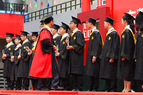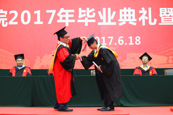 下午3点,仪式在黄辉副书记的主持下,准时开始。首先,院长袁华强教授上台致辞。在致辞中,袁华强院长向所有顺利毕业并取得学位的同学致以最衷心的祝贺和最美好的祝愿,也向为培育同学们而付出心血和汗水的所有老师和家长表示感谢和敬意。紧接着,江源辅导员宣读了优秀毕业论文获奖者名单,并由副院长徐钦桂教授为获得优秀毕业论文的同学颁发奖杯。最后,仪式来到学位授予环节。袁华强院长为学士学位获奖者一一扶正流苏,并颁发学位证书。至此,仪式圆满结束。