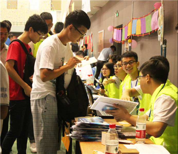 计算机与网络安全学院的新生报到地点在松山湖校区体育馆内,学生志愿者主要负责本学院报到点的工作,包括新生资格初步审查、校园卡及相关资料发放、学生档案回收、学院迎新宣传及氛围营造。学生志愿者为新生指引道路,协助新生完成住宿安排、领取校园卡、领取热水卡、购买军训用品等一系列工作。