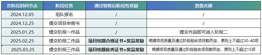 1. 项目在每个阶段若无法通过验收,则直接淘汰,无法进入下一阶段。
