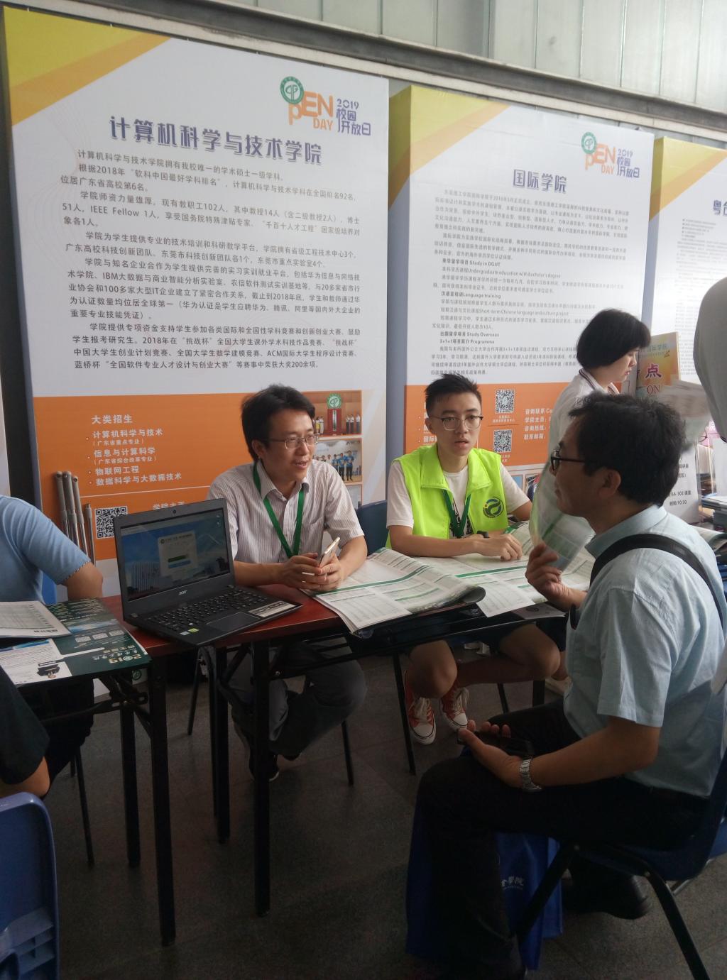 为使众多高考毕业生能够更好的志愿填报以及专业选取,我校于2019年6月22日在松山湖校区图书馆举行校园开放节活动。我院副院长刘群锋,李学强老师、卢安老师、陈传祥老师、李国歌老师、周如川老师以及我院ACE机器人俱乐部的同学和志愿者等参与了此次校园开放日的接待咨询工作。