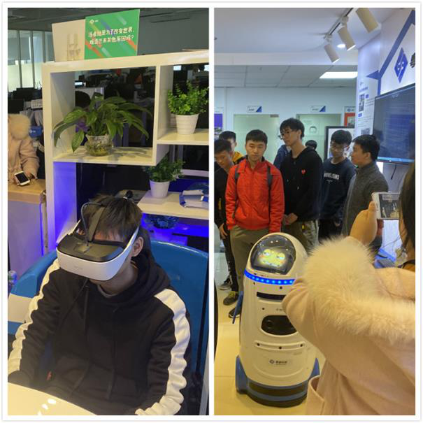 在戴小丽的带领下,东莞理工学生一行参观了粤嵌科技的党建活动中心、众创空间和产品研发中心等区域。参观期间,学生们体验了VR虚拟驾驶设备,与机器人大吉进行了简单的互动。