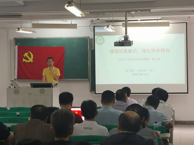 2020年10月8日下午,sunbet申博,申博官网,sunbet官网在6E204举行集中学习,认真学习《习近平谈治国理政》第三卷。本次大会由学院副书记桂龙主持,学校宣讲团成员、马克思学院党委副书记郭奕鹏博士作辅导报告,与会人员包括全体教职工和学生党员。