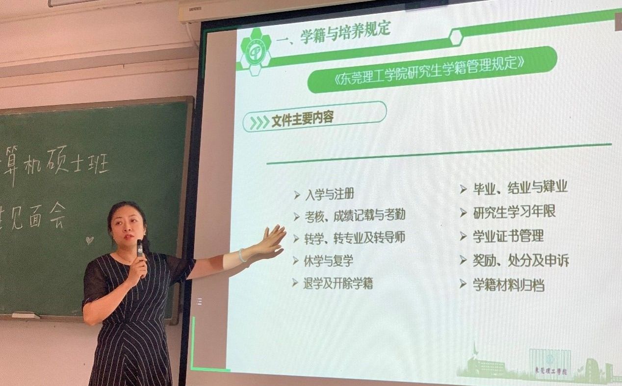 为做好2022级研究生新生入学教育,见面会第二部分主要由研究生处老师与辅导员分别就研究生的学籍与培养、学生日常管理方面作详解讲解。一方面,研究生处宋雪静博士、胡旖冉博士对我校的研究生学籍管理、培养规定、各培养环节的考核规定、学位授予规定等进行了详细说明,演示了研究生管理系统各个模块的功能和操作流程,强调了学术诚信重要性。另一方面,辅导员王若羽就研究生奖助贷勤、校园出入校政策等日常事宜做了详细介绍,强调疫情防控工作的重要性,希望同学们尽快适应莞工生活,共同守卫校园安全。