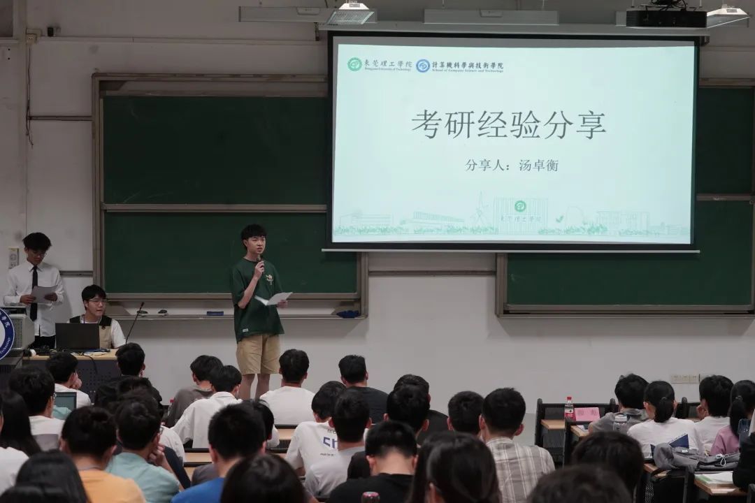 分别被华南理工大学、深圳大学、广东工业大学、华南农业大学、广州大学、海南大学以及广西师范大学录取的谢嘉胤、黄嘉诚、陈泽鹏、汤卓衡、黄汇洪、冯子鸣、陈淼等七位同学依次向同学们分享了个人成长历程、报考院校有关情况,并结合自身经历从考研动机、学习方法、择校经验、资料准备、时间安排、计划制定等方面向在场同学分享备考经验,强调备战考研要加强专业知识、夯实数学基础、提高政治敏感度和丰富英语阅读能力,为同学们提供了行之有效的备考建议。