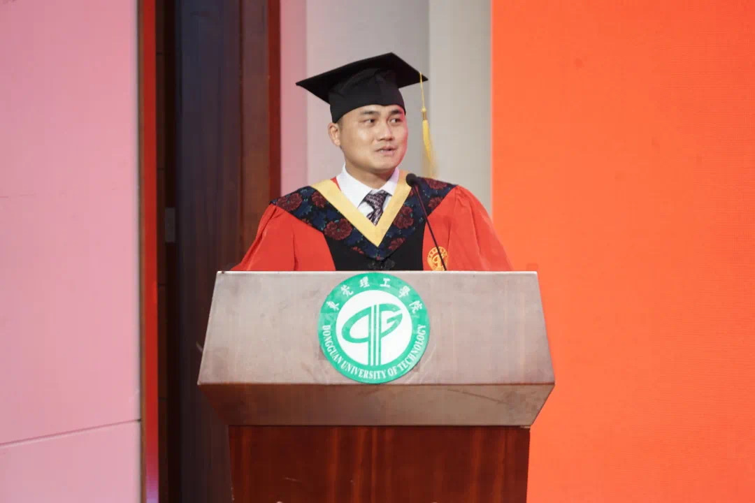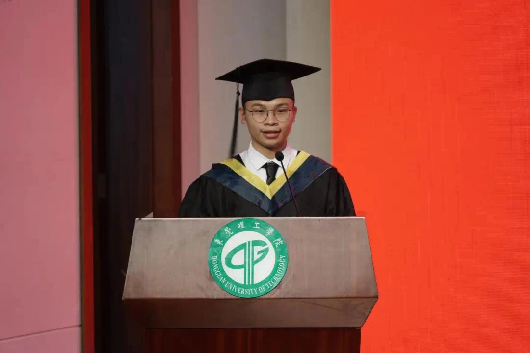 接下来,毕业班学生代表陈允强上台发言,“大一时,我们怀揣着对新生的美好憧憬进入莞工,那时候,大家脸上都带着些许稚气,四年的大学时代,我们都经历了很多,没有不同的命运,只有不同的选择,在这四年里,莞工在我们心中留下了足够多的回忆,而这些回忆也会随着时间在我们心中越发宝贵。”