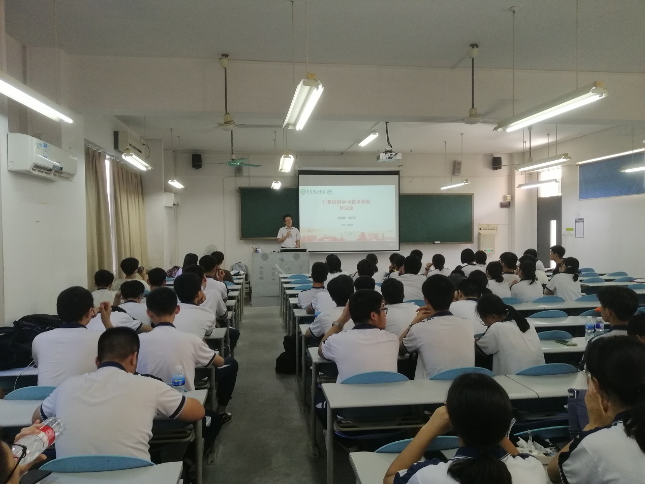随后,刘群锋副院长对学院的基本情况进行了说明,包括办学历史,办学特色,学科专业、科研实力、师资力量,人才培养、大数据、人工智能等,为中学了解学院、了解专业提供极大的便利,也让中学更加细致地感受到我院的学科实力和办学水平,让学生的报考目标更加坚定,取得极佳的宣传效果。