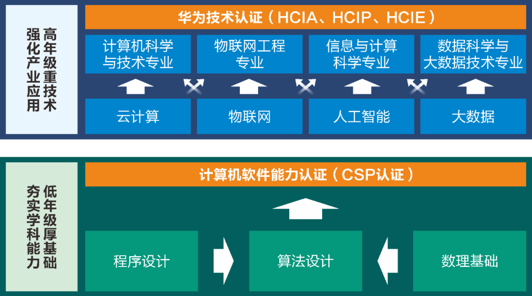学院紧扣ICT(信息通信技术)现代产业的需求,前三个学期不分专业,主要以计算机软件能力认证(CSP认证)为学习主线,统一开设编程语言类和算法分析与设计类课程;第四学期将分专业学习,以各专业的核心知识为基础,结合华为认证为学习主线,开设华为物联网、人工智能、大数据、云计算方面的HCIA、HCIP和HCIE认证课程。