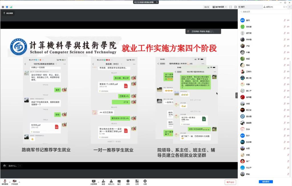 学院学工办主任邓武均分专业、分班通报了2022届毕业生的就业情况,并且对我院的就业工作实施内容作出了四个阶段的详细部署,提出了几点建议:一、与学生一对一建立联系,做好就业台账,了解同学们的现状及需求,并且及时反馈;二、利用好学校就业信息网,给同学们精准推送招聘信息;三、领导小组、就业指导中心、班主任和辅导员、校友办等多方联动,共同推进学生就业。