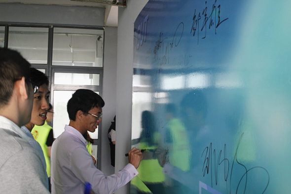 从早上八点开始,陆陆续续就有年纪不等的校友前来电子楼,参加本人的校庆活动。在外忙碌漂白多年的校友们,终于回到了这个熟悉而又陌生的校园,大家纷纷表示感慨万千。在志愿者的引导下,校友们来到了签名板前,用现场提供的签名笔,在板上留下了自己的大名。那些字迹,已经不是当初的那种拘谨青涩的学生签名了。取而代之的,是神采飞扬,遒劲有力的大号签名。