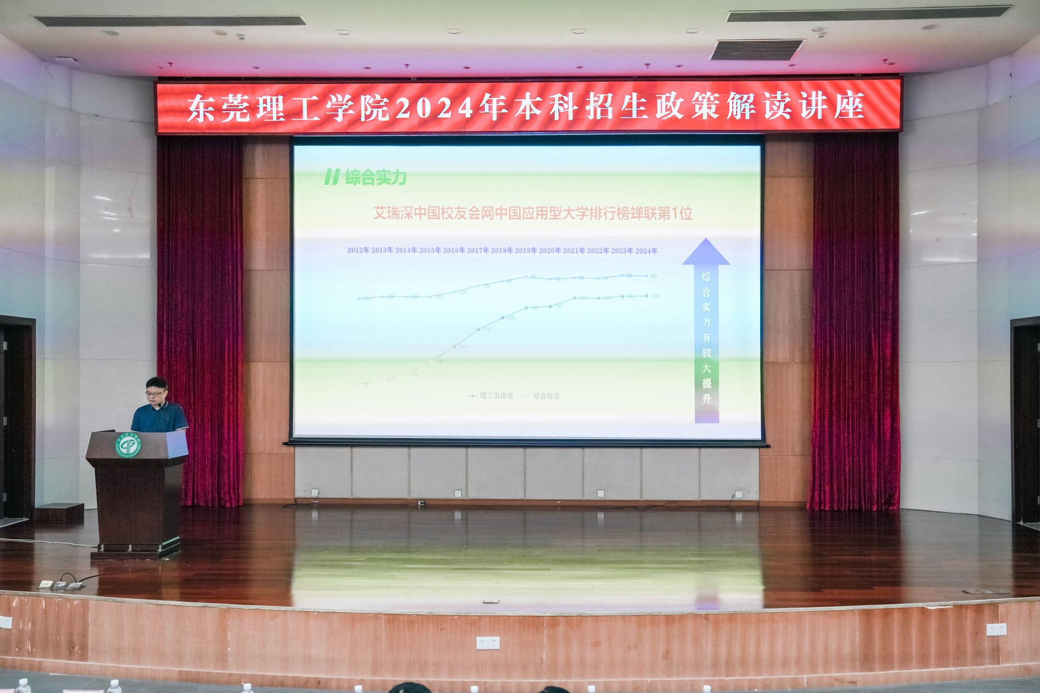 讲座上,学校教务部(招生办公室)部长王红成详细讲解了莞工2023年本科招生录取情况、2024年本科招生新政策,以及选择莞工的十大理由。