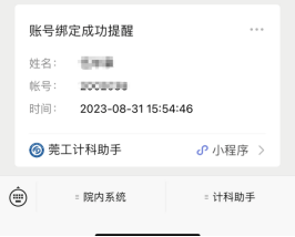 6. 点击模板消息后,将自动跳转官方小程序【莞工计科助手】,从此入口进去,小程序将自动绑定当前的中央认证账号。