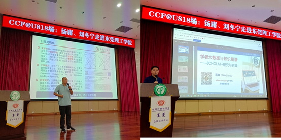 汤庸教授的演讲主题为《SCHOLAT+:学者大数据与知识图谱》。他主要讲述了面向学者的社交网络(SCHOLAT)的发展,进一步构建学者大数据写作平台与云空间融合模式,促进SCHOLAT+应用生态等新形态演进。汤庸教授强调,学生也需要有意识地加强自身对学者大数据的有机运用,夯实计算机专业思维和专业能力。刘冬宁教授作了题为《人工智能逻辑与角色协同计算》的报告,展开了数字中国对推动“智能协同”发展的讨论,引导在座师生对“人工智能技术推动产业变革”、“应用驱动创新”、“人工智能技术是基础”等方面的思考。