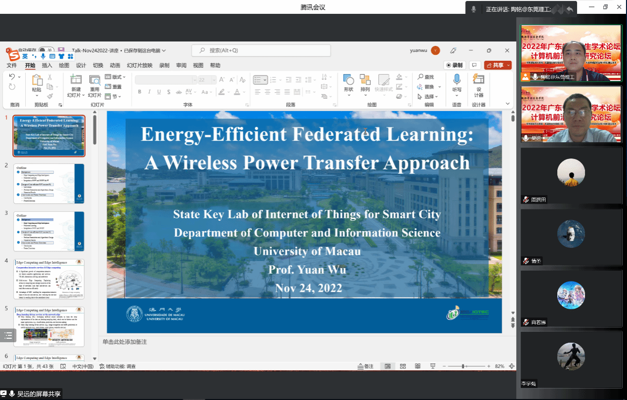 吴远教授率先做了“Energy-Efficient Federated Learning: A Wireless Power Transfer Approach”的主题报告,介绍了在无线网络中实现高效分布式机器学习与模型训练的最新研究进展。他详细阐述了基于无限传能辅助的联邦学习优化设计方案,讨论了无限传能机制联邦学习中多种应用形式,并从无限传能策略、多用户训练模型数据传输资源调度、以及联邦学习全局-本地训练模式的联合优化角度出发进行方案设计。报告最后,吴教授指出:联邦学习作为一种典型的分布式学习框架具备保护用户数据隐私同时实现分布式模型训练的优势,但无线网络中较为有限传输带宽和能量资源是制约联邦学习性能关键要素,利用无限传能这一灵活的能量供给模式能够有效提升联邦学习的自持续性能。